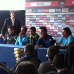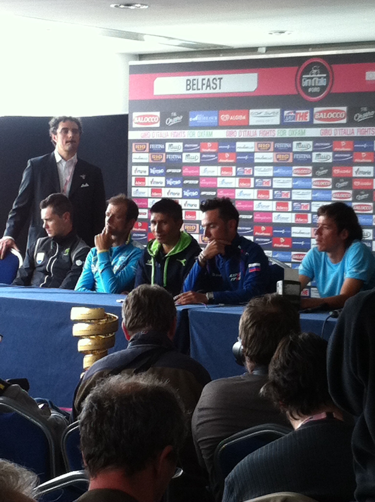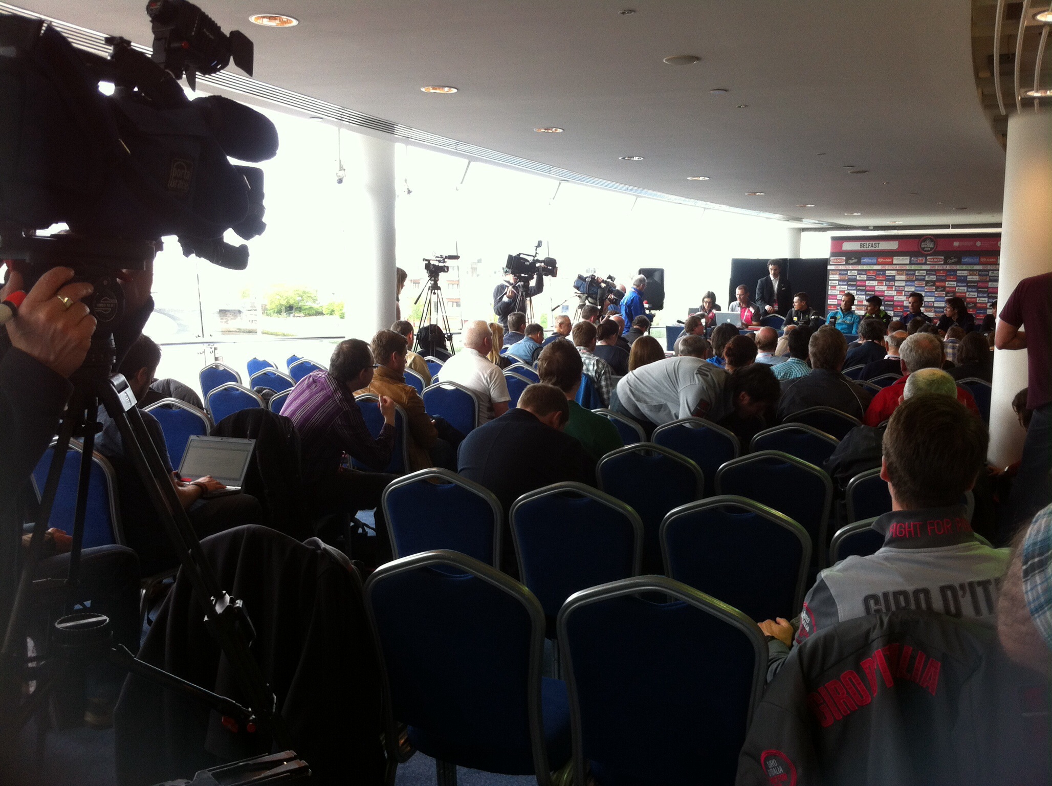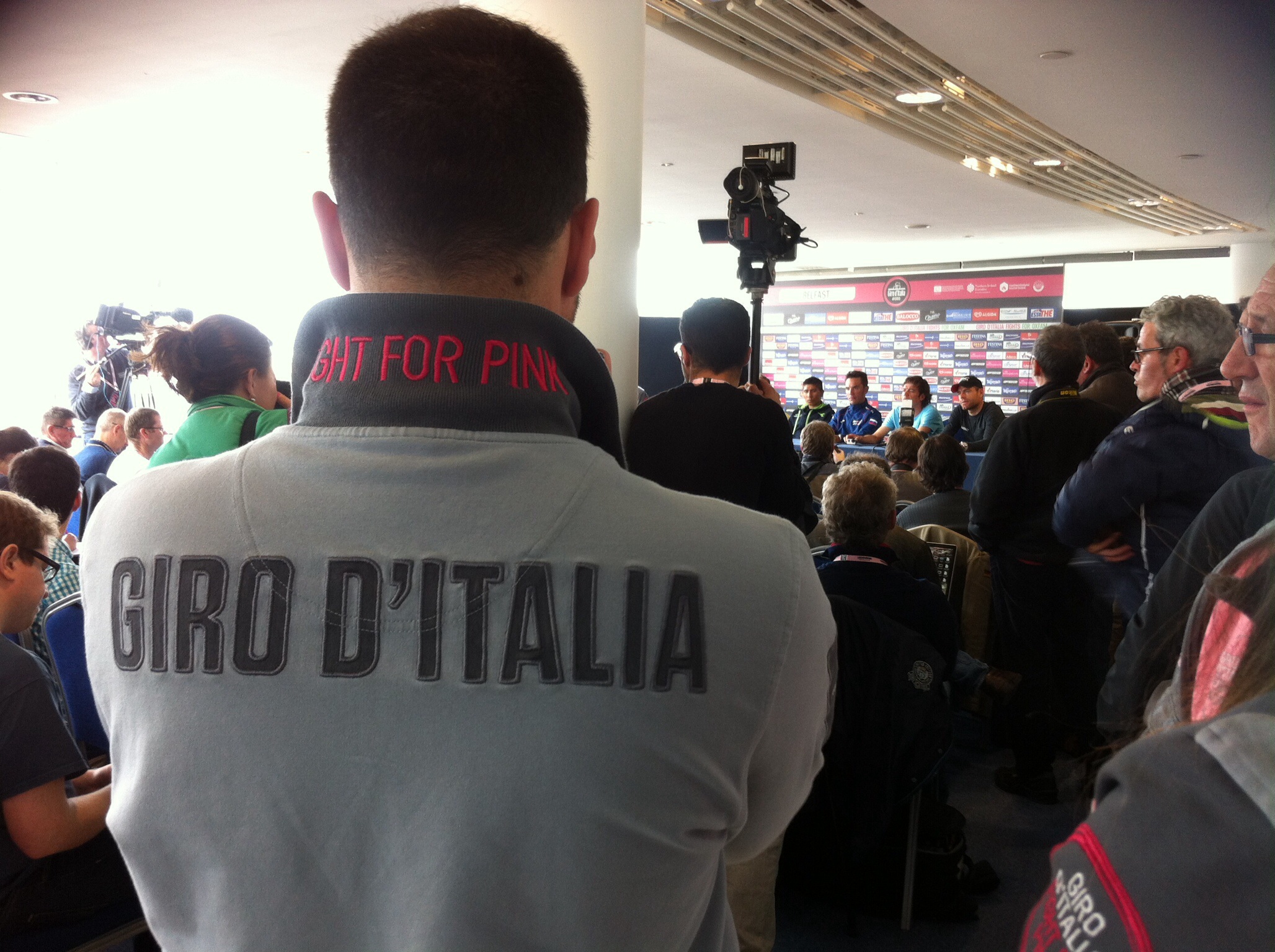 Thankfully, by the time the afternoons main press conference started, the sun had come out to greet the international press as they assembled with the Giro’s golden trophy. This was my first big presser as the hacks tend to call them. There where plenty of TV cameras as well as still photographers, and an interpreter to translate the media’s questions and the cyclist’s answers. Matteo was on hand to keep things running smoothly.