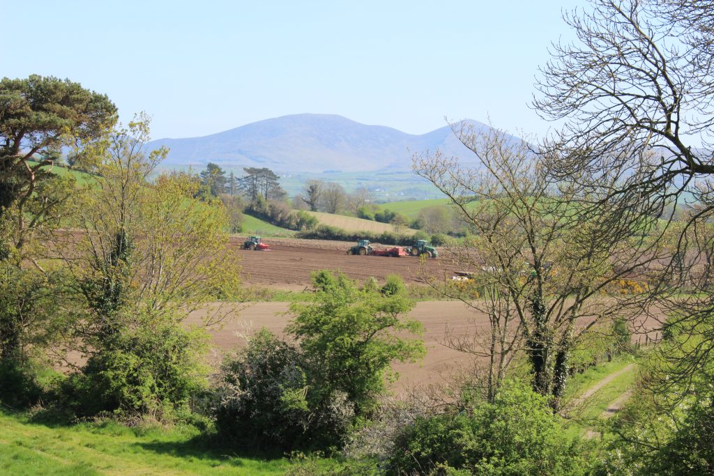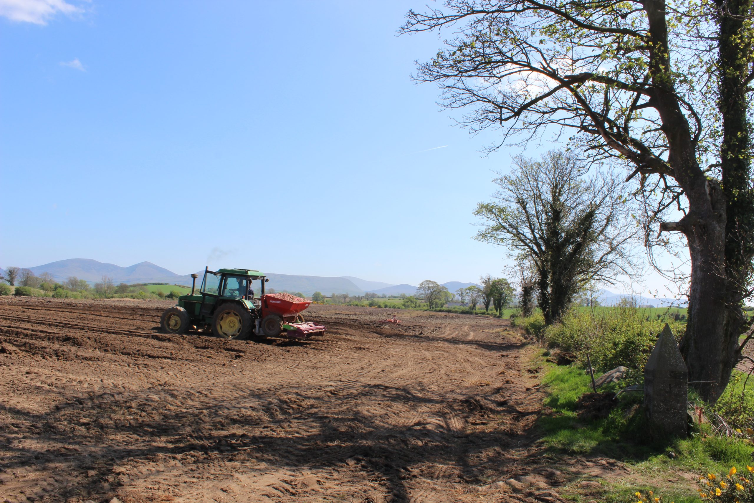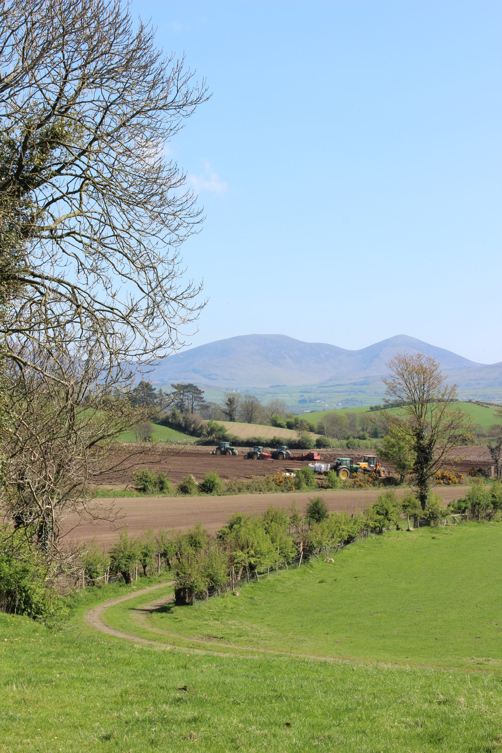 In a different field on a sunny afternoon, I photographed planting on a large meadow overlooking the wonderful Mourne Mountains. My favourite shot is the header on this blog article, where I have managed to get the rolling countryside, a narrow lane (bottom right) and a team of tractors all framed nicely between the purple mountains and a blue, clear sky.