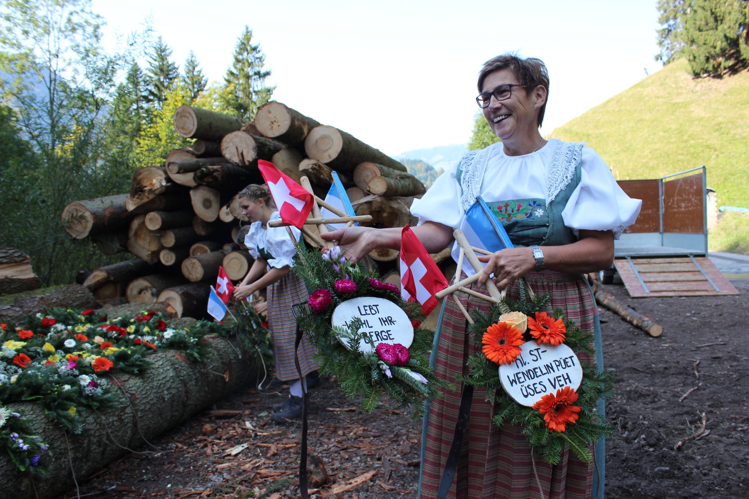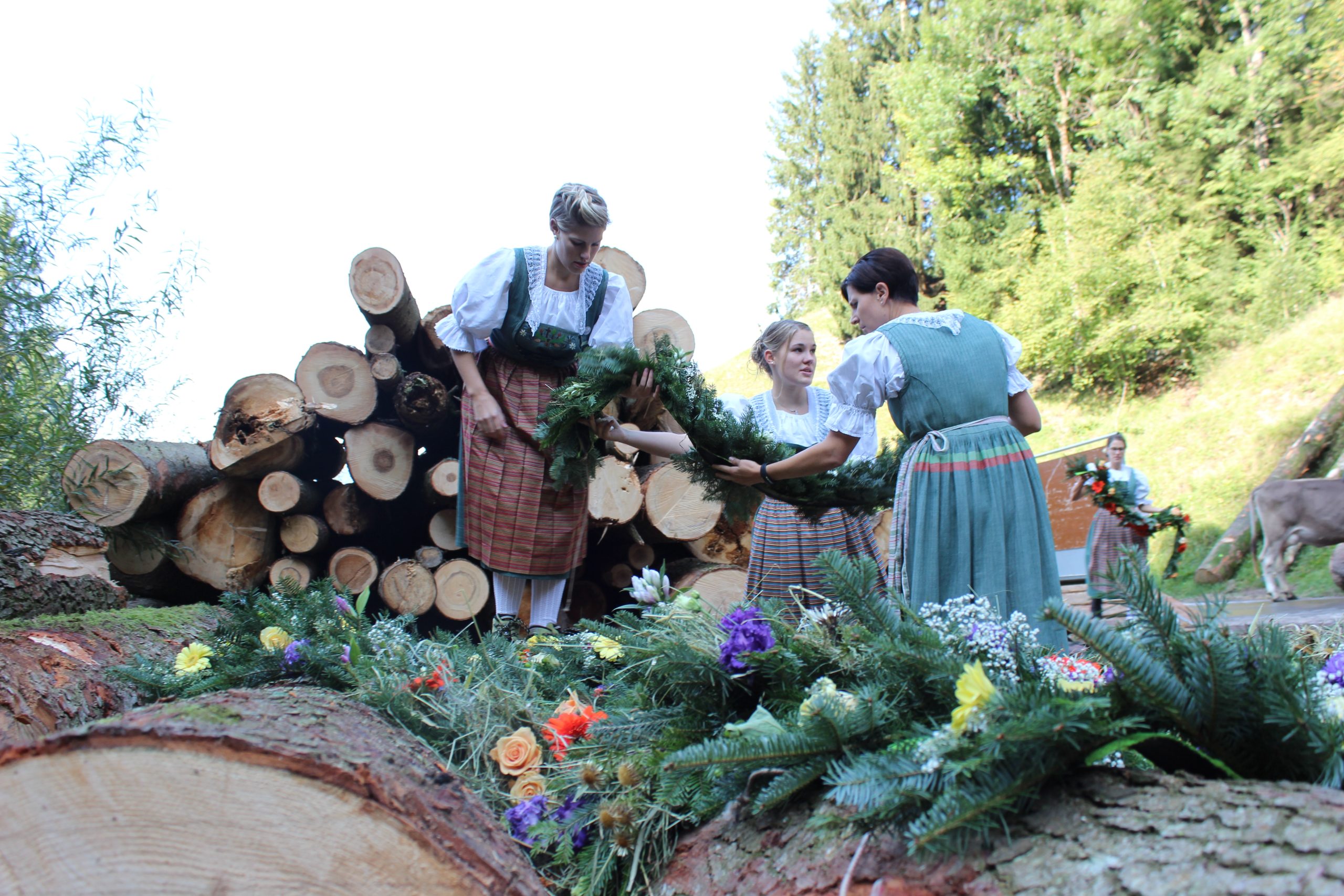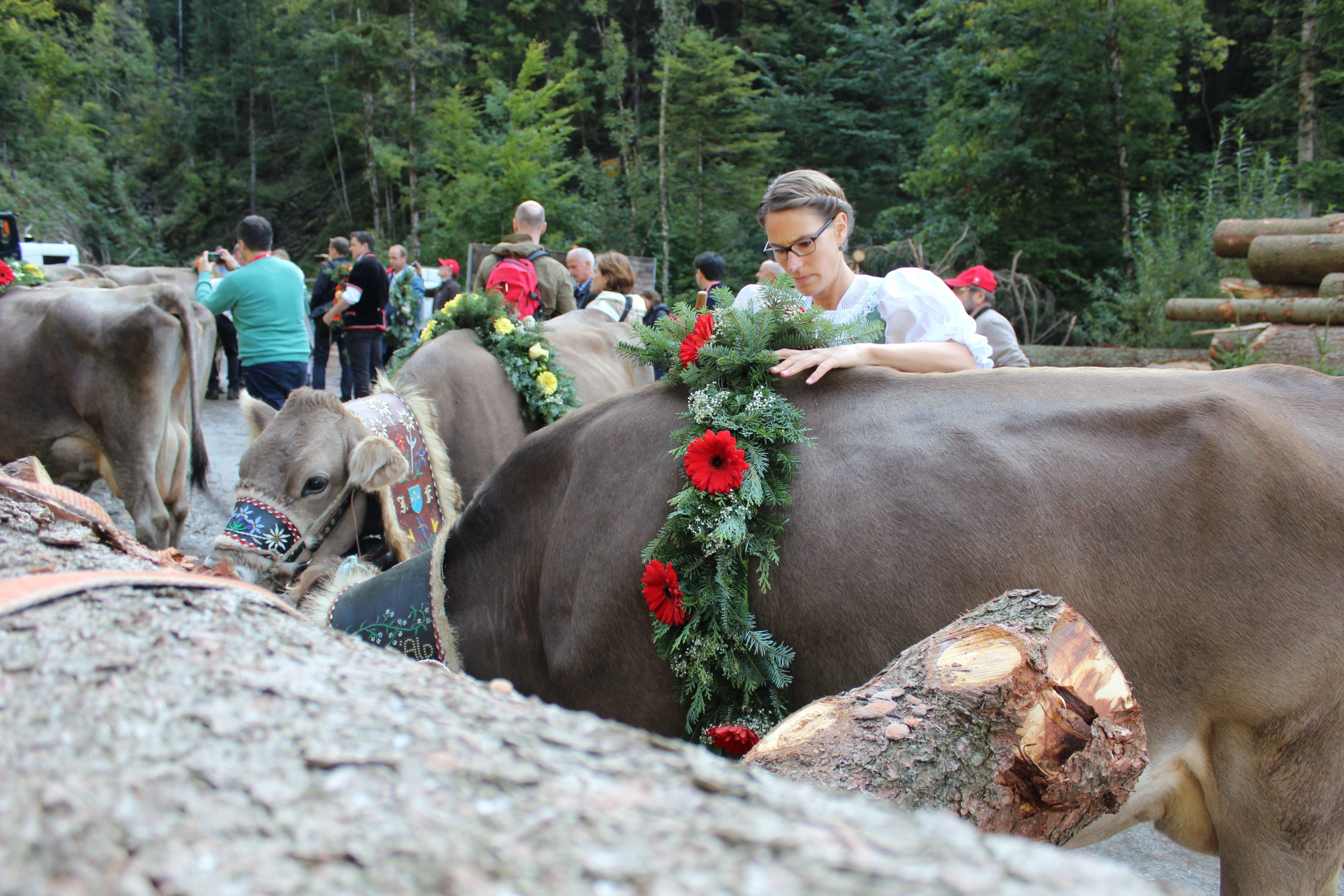 As part of the International Federation of Agricultural Journalists press tour, we got to visit a family preparing their cattle up in the Alps before they walked the 11k down into Schüpfheim. Our minibus took us up the narrow windy road to a forest area beneath one of the Alps. When we arrived at 10.15am, about 20 cattle were tied to tree logs as their owners were power hosing them clean. The female family members, wearing traditional Swiss costume teamed with modern hiking boots, brought out beautiful floral arrangements they had carefully prepared the day before from a trailer and set them out on other logs. There were yellow roses mixed with gerbera daisies, purple and white spreads, and orange gerberas mixed with peach roses.