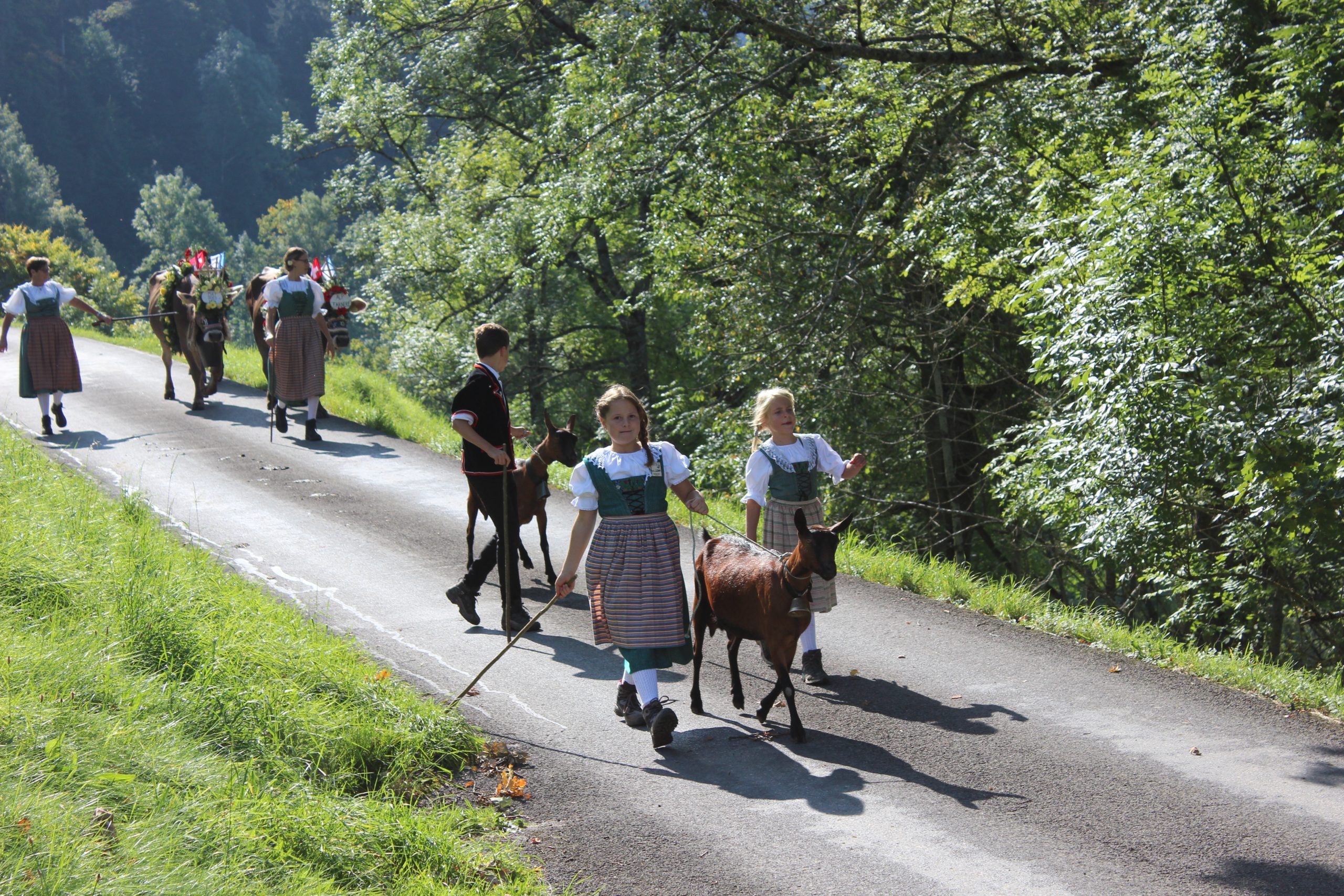 The first cows’ headpieces included the Swiss red flag and also the blue and white flag of the Canton Lucerne. With the backdrop of the forest and the Alps, we enjoyed watching them parade past, some trying to sneak in a bit of grazing to keep them going on their journey to Schüpfheim.