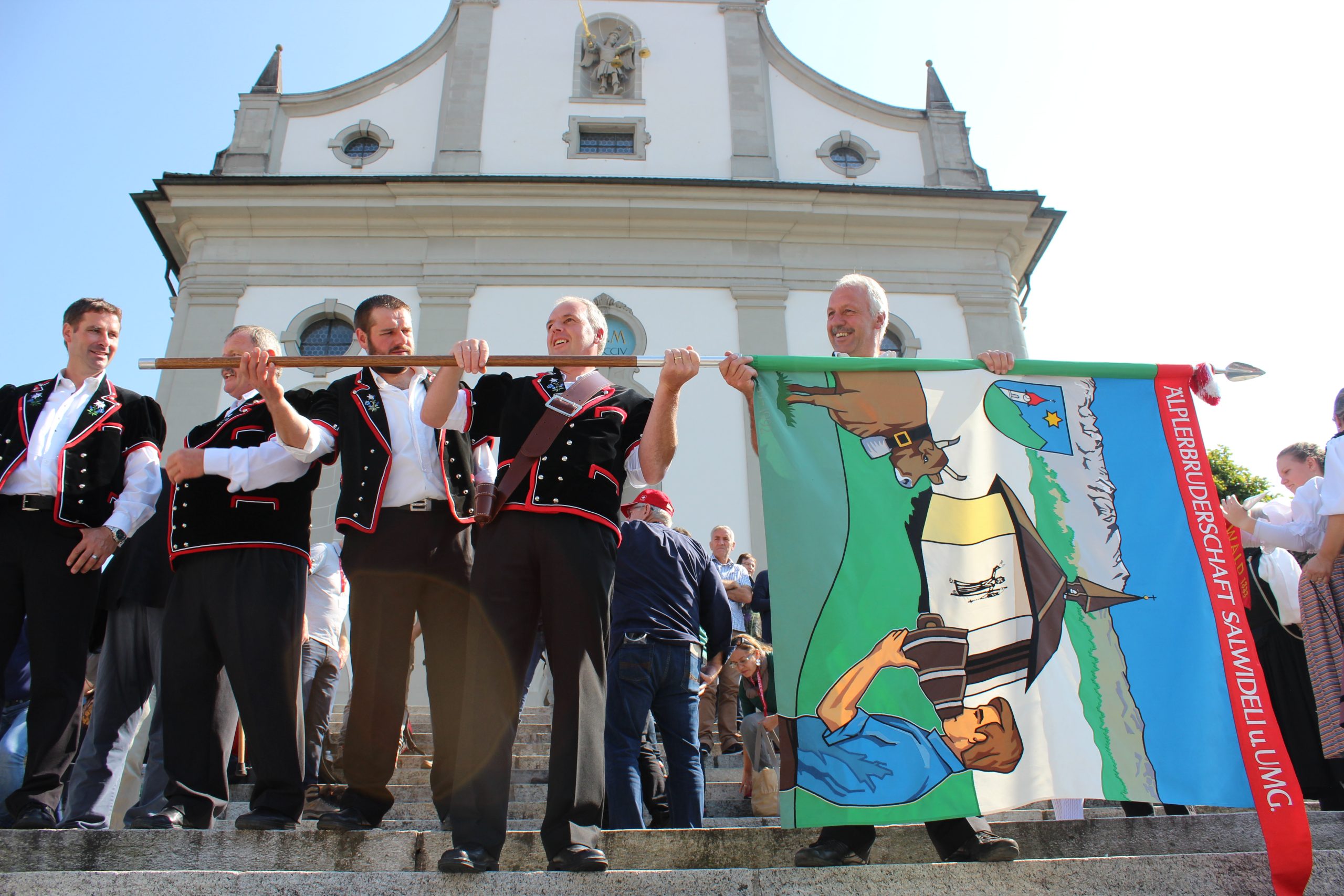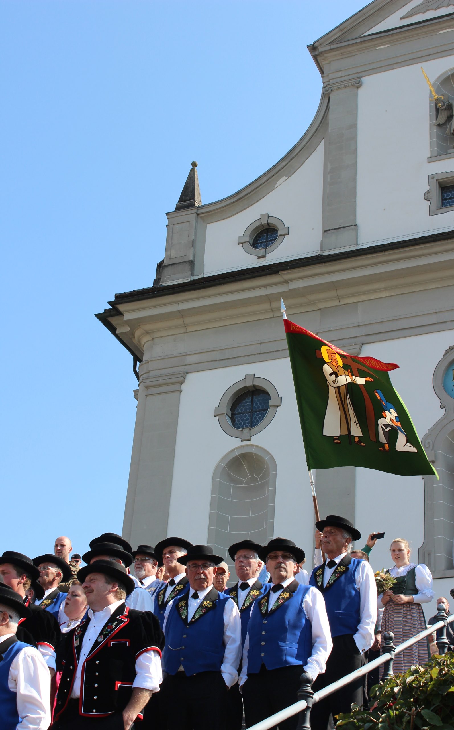 Around 1 o’clock, with all of the cattle down from the 7 different Alps, the crowd headed to the Pfarrkirche Johannes und Paulus (Parish Church) where a large choir had formed on its impressive steps. The singing, or yodelling as they like to call it in Switzerland, was simply stunning especially when there were no musically instruments accompanying them. The finale was lead by a group playing alpenhorns or alpine horns – the sound they made was incredibly beautiful.