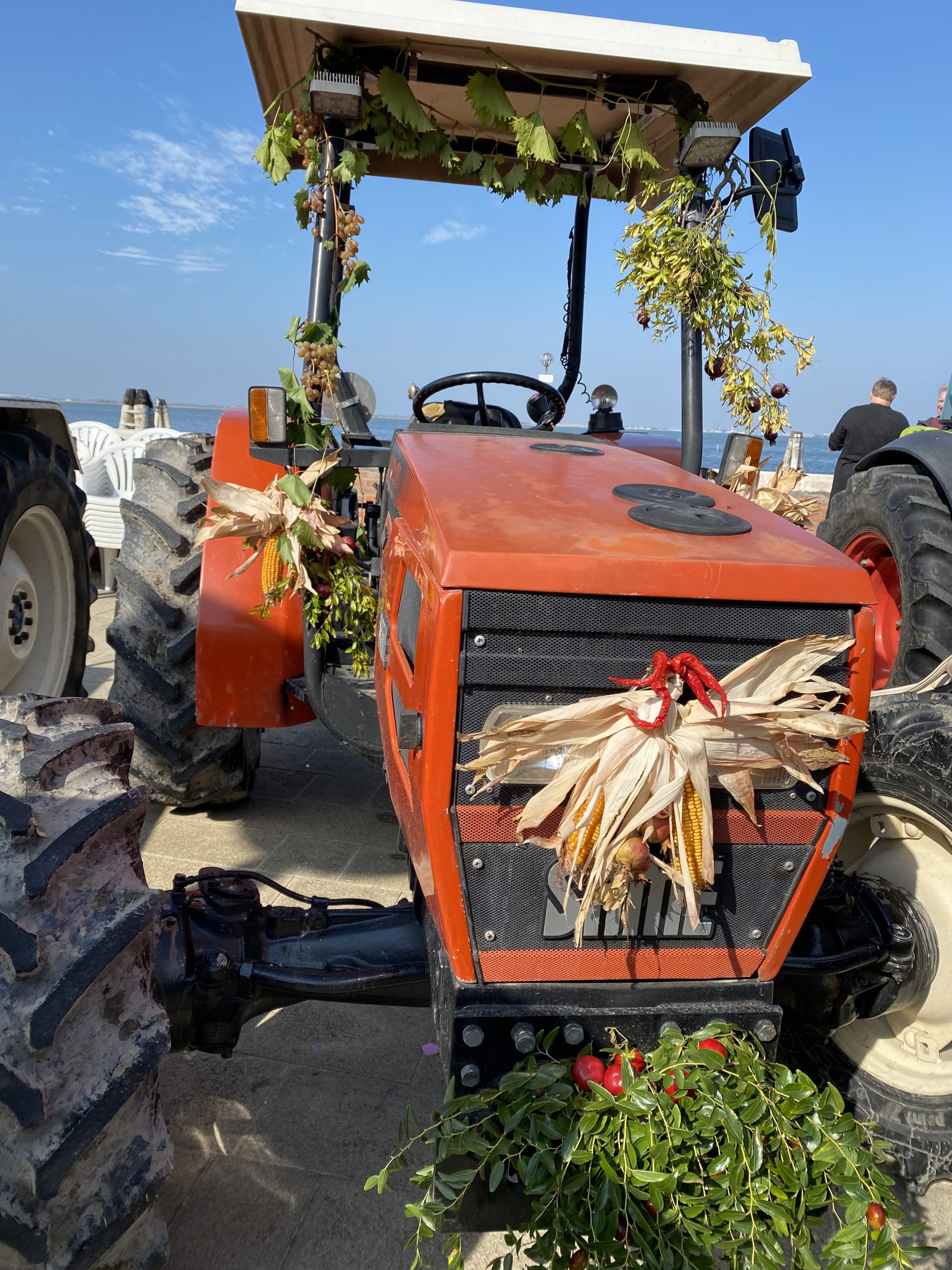 We dock at Sant’Erasmo, an island home to just 800 people, referred to as the vegetable garden of the Doges, the rulers of Venetian life up until 1797. The weekend we visit, there is a festival to celebrate the harvest of the grapes in the area which the island is famous for. There is a party atmosphere and stalls and lots of activity on a stage. In a display of tractors, a red Same is decorated with flowers and is a popular spot for visitors to jump into the driving seat for a photograph.