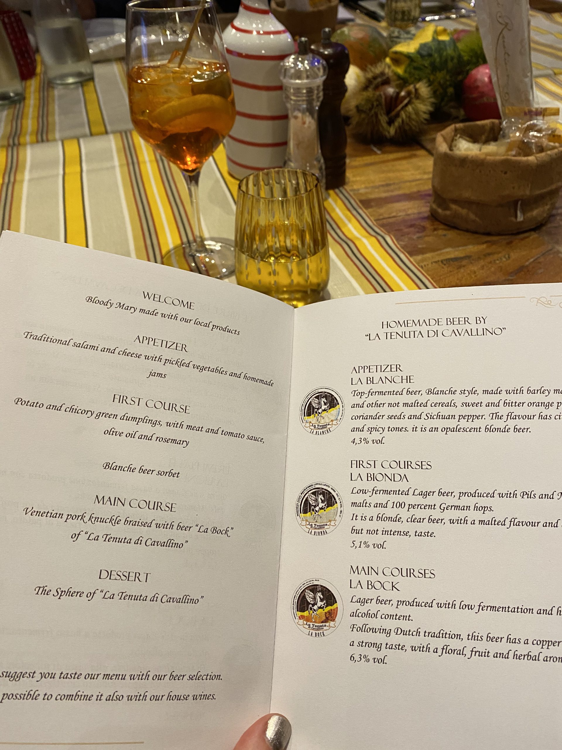 That evening, we took a ten minute walk to the restaurant linked to our campsite – La Tenuta di Cavallino – which can be translated as the estate of Cavallino. This restaurant used to be farm sheds and you can tell with the high ceilings and wooden beams. It has become a landmark in the area having blended traditional style and characteristics with a modern renovation to incorporate an open-air brewery. Many patrons were enjoying their pizza overlooking the large copper vats. As we walked through to the private dining space with our Aperol Spritz in hand, the pizzas looked and smelt amazing, however they weren’t on our menu. Instead, we had a fine dining experience of six courses ahead of us!