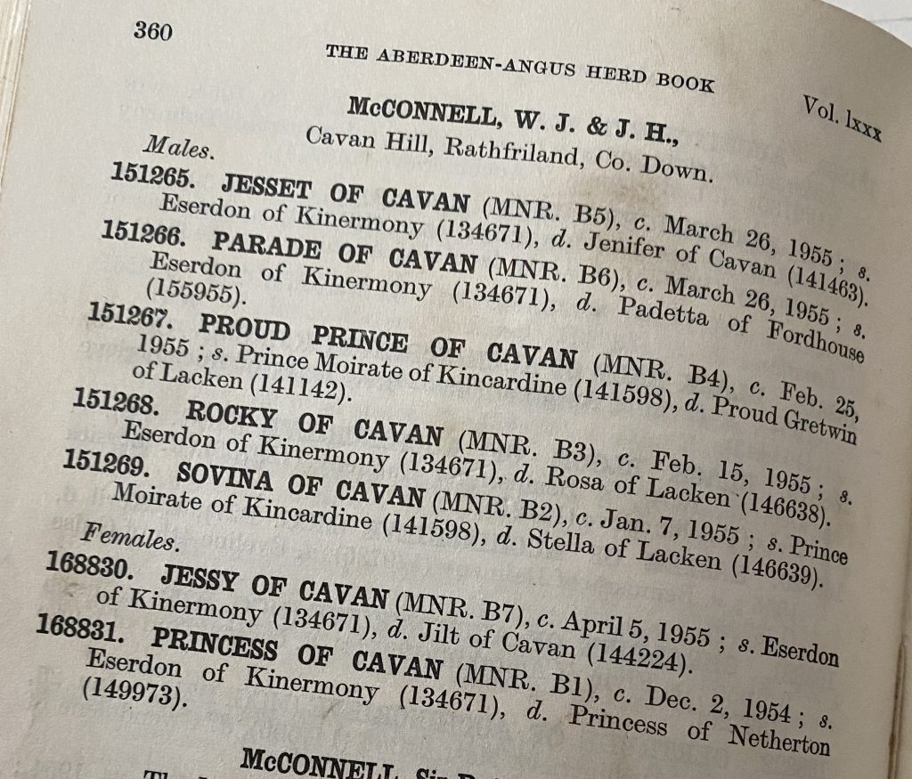 Cavan is our townland in County Down and the name of our family farm is Cavan Hill. It was the passion of my grandfather, James, and his brother William (Bill) to breed Aberdeen Angus cattle and show them. In our family home are hardback copies of the official herd yearbooks and the wealth of information in them is incredible. These themselves are fascinating records and tell part of the history of our farm, especially when family are no longer here to tell and recall the story. Each year, pedigree cattle born were listed with their date of birth, dam (mum) and sire (father) along with their official names. Female names in the herd included Jessica of Cavan, Patsy of Cavan and Jessinina of Cavan; and males Rocko of Cavan, Penman of Cavan, Julian Eric of Cavan, Peerless of Cavan and Grandee of Cavan. My favourites though have to be Princess of Cavan and the Proud Prince of Cavan, the latter of which took his name from both his parents.